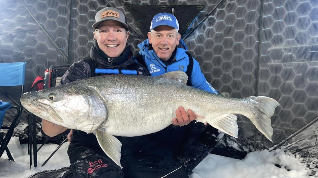 In winter, lake trout commonly suspend over deeper structure, which makes sonar and camera work especially effective. Jigging tubes, spoons, and rattle baits are reliable producers, and as winter progresses, trout often slide slightly deeper but remain catchable through the core of the season.